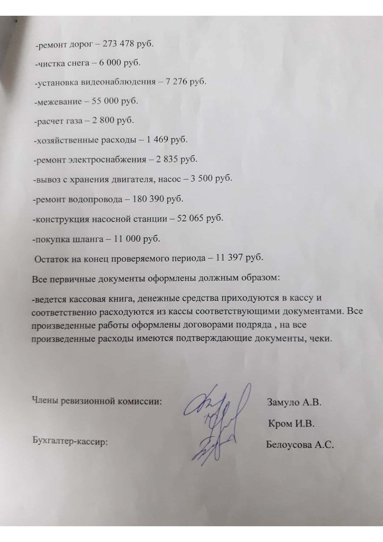 Любопытный документ. Все цифры как под копирку переписаны со сметы 2018. Как это возможно, если в балансе 2018 года указано, что израсходовано всего 614 тысяч и все эти средства израсходованы на содержание аппарата управления! Разумеется, ведь ревизионная комиссия "избрана" на заседании правления. Причем по закону в ревизионной комиссии не может быть менее 3 человек, а здесь всего 2, из которых один - Кром, который является членом правления, которому запрещено быть в ревизионной комиссии, а вторая - Замуло, которой также запрещено быть в ревизионной комиссии, поскольку она не является членом товарищества.